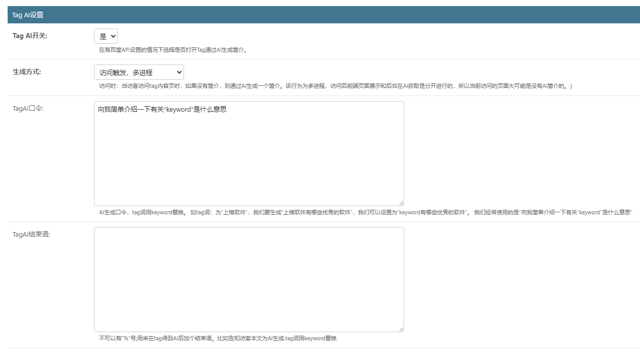 TagAI结束语:不可以有“%”号;用来在tag得到AI后加个结束语。比如告知访客本文为AI生成.tag词用keyword替换