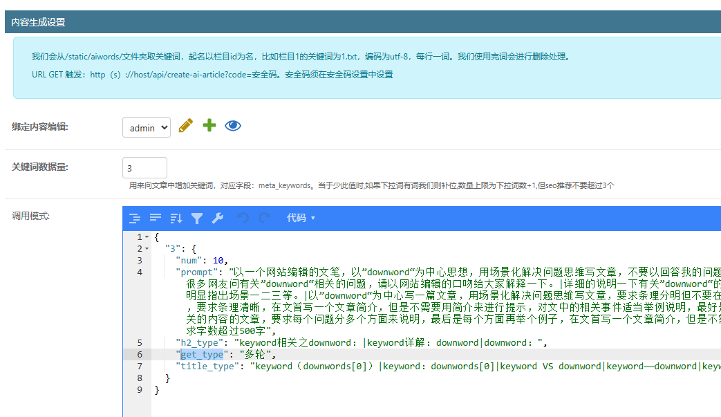 "prompt"==》内容生成口令。支持keyword\downword两个变量,支持“|”分割不同口令