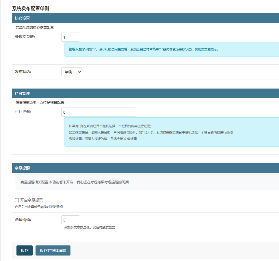 当API被触发的时候, 系统会在设置栏目的限制内抽出有文章状态不为“已发布”的文章进行发布,多个栏目时随机选择栏目。