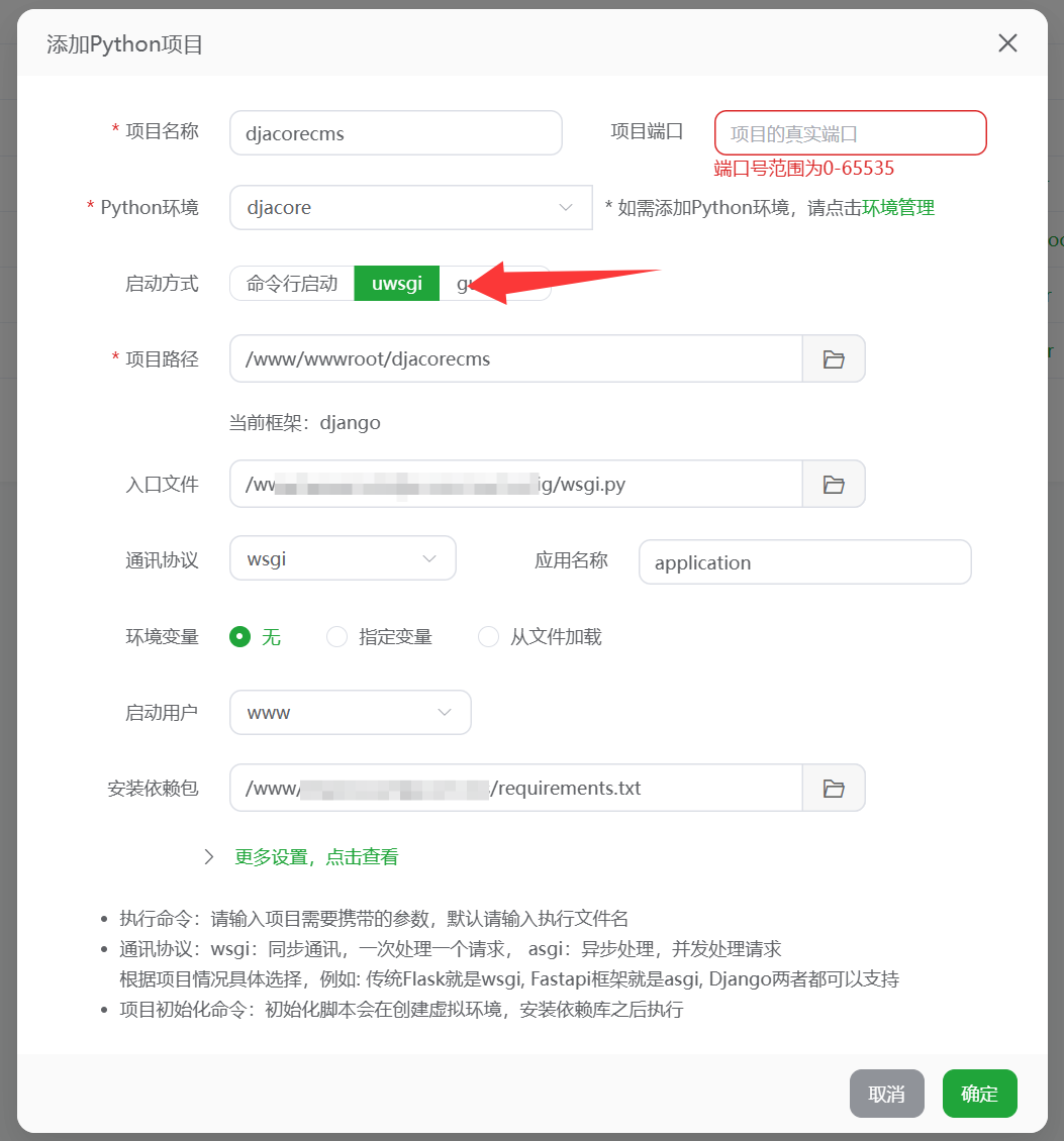 - 入口文件和通讯协议:如果入口文件选择wsgi.py,那么通讯协议选择wsig.py,asgi同理