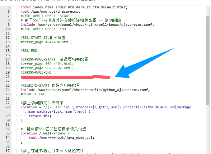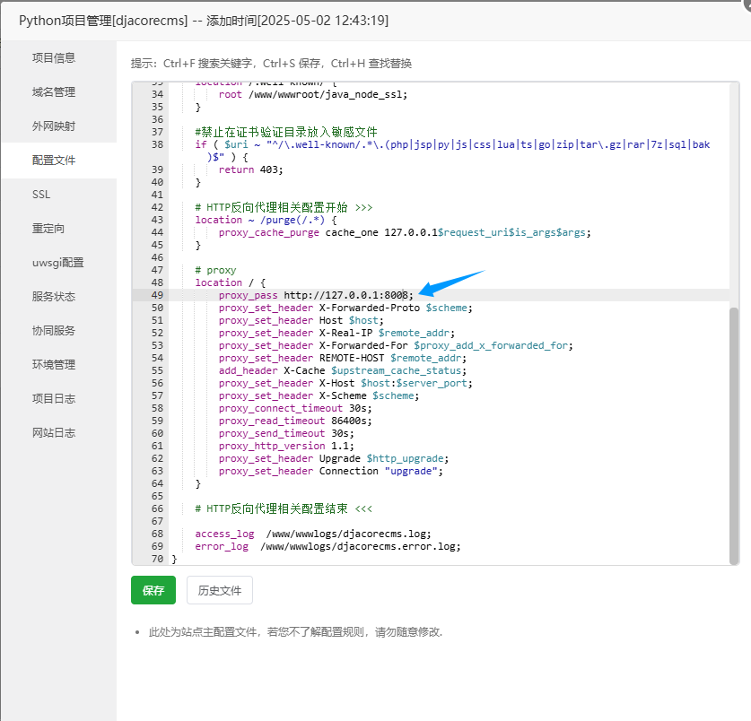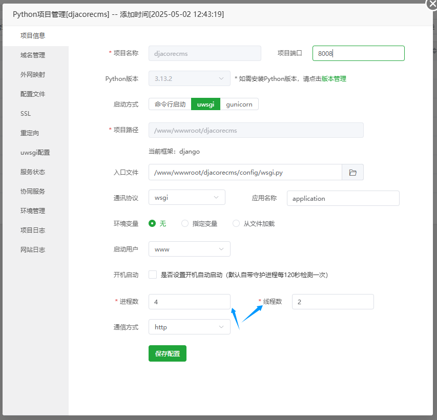 系统会在项目的uWSGI配置文件末尾当中自动加入下列内容: