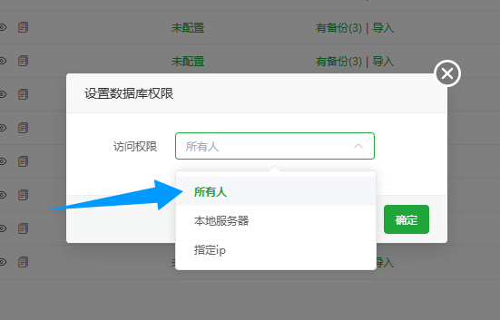 如果是Docker安装的数据库我们还需要设置一下权限,在我们刚才新建的数据库右侧有个权限,我们点击选择所有人