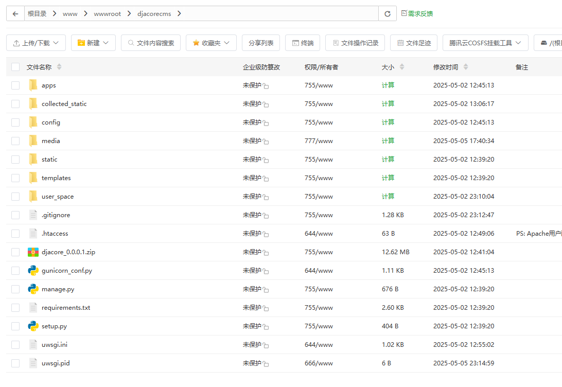 /www/wwwroot/djacorecms我们将下载下来的文件放入djacore中进行解压。