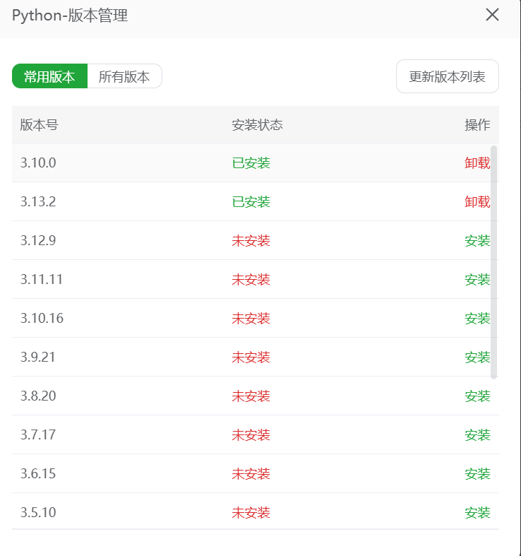 选择版本管理,选择合适版本的python,我们使用的是3.13,大家可以根据自己的需要选择,理论上目前要求是3.11以上的版本,具体的需要实测