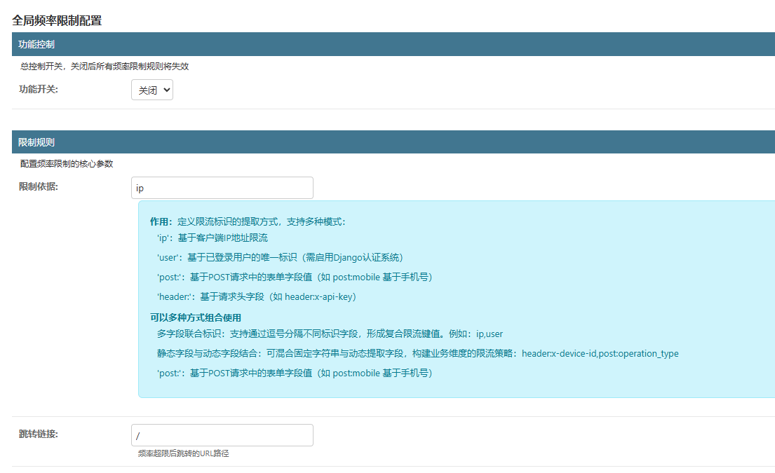 | 跳转链接 | ratelink | CharField | '/' | 频率超限后跳转的URL路径。 |