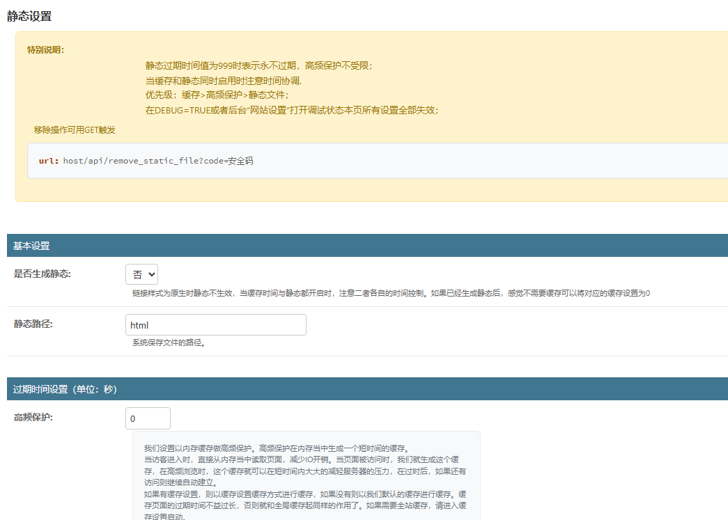首页静态过期时间static_indexPositiveIntegerField3600单位:秒